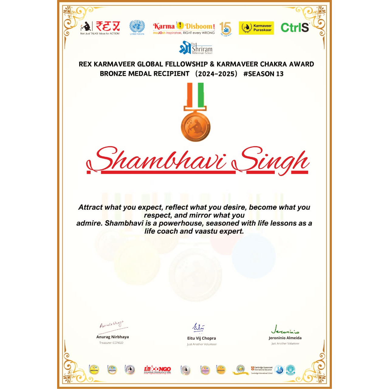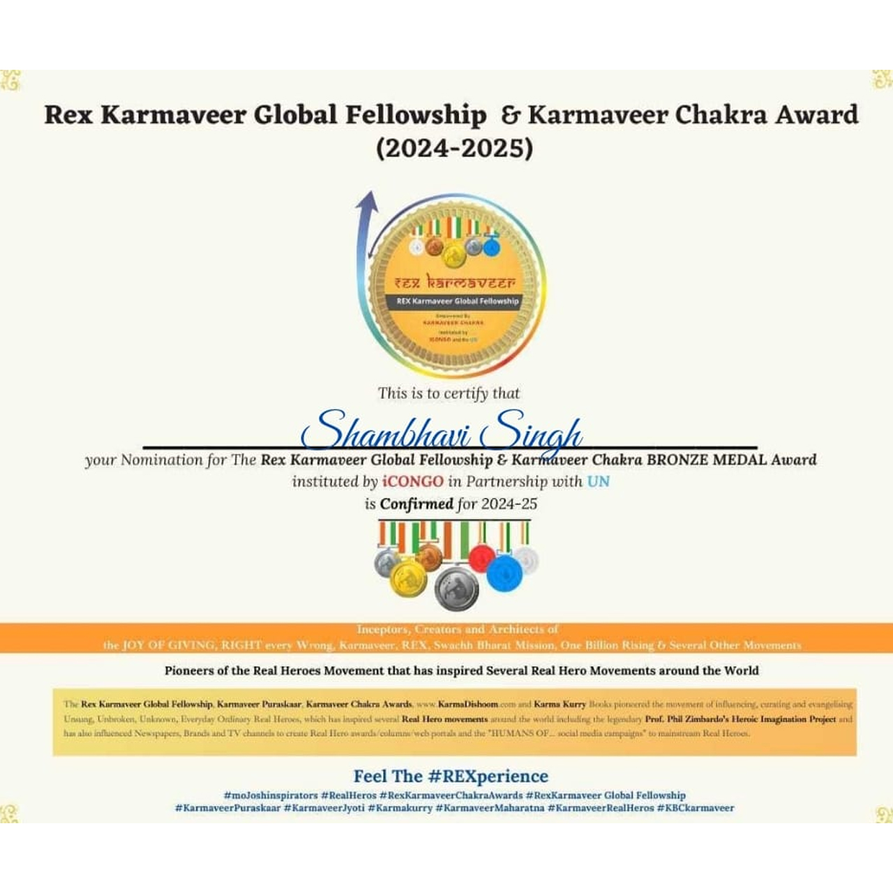 The REX Karmaveer Chakra Award, presented alongside the Karmaveer Global Fellowship, is an international civilian honor that recognizes individuals dedicated to driving positive social impact and advancing social justice. Instituted by the International Confederation of NGOs (iCONGO) in collaboration with the United Nations, the award carries forward the legacy of former Indian President Dr. A. P. J. Abdul Kalam, who served as its ambassador. It celebrates the spirit of “Be the Change” by honoring unsung heroes—those who choose unconventional paths to create meaningful change across diverse fields such as activism, education, healthcare, and volunteering.